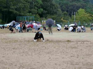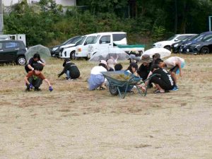 20日(土)にPTA愛校作業を行いました。グラウンドの草取りと学校周りの草刈り作業できれいになりました。開始前から小雨が降ったり止んだりでしたので、少し早めに開始し、早めに終了しました。作業が始まってまもなくすると、雨。雨に濡れての草刈り作業に、傘をさしての草取り作業となりました。