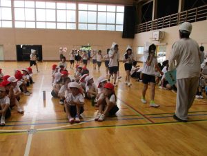 29日(月)に消防署の方にも来ていただき、命を守る訓練を行いました。今回は、休み時間の終わりに予告なしでの実施でした。地震のあとに家庭科室から出火し、放送機器が使えなくなったために、拡声器を使った指示を聞いて避難するという訓練でした。教室から防災頭巾を被って避難する子、グラウンドから戻ってきたばかりで赤白帽子を被って避難する子、それぞれの場所から、静かに避難場所の体育館まで移動することができました。