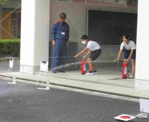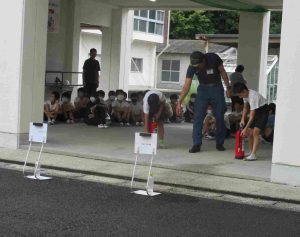 5、6年生は、消火訓練も行いました。消化器の使い方(ピンを抜く・ホースを火元に向ける・レバーを握る)を教わって、一人一人実際に消化器を使いました。消化器を使うことと、「火事だ!」と大きな声で周りに知らせることもとても大切だと教わりました。