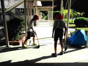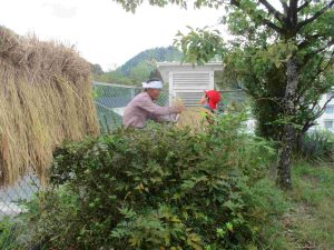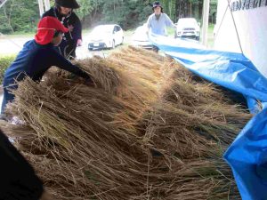 30日(火)に、学校のフェンスをはざ代わりにして干しておいた稲を2日(木)の脱穀に向けて、はざからおろしました。米作りで協力いただいている中山さんも急遽駆けつけてくださいました。中山さんや担任がフェンスから稲をおろし、5年生はそれを受け取って体育館玄関横まで運びました。次々と運ばれる稲は、みるみるうちに積まれていき、1時間もかからずに作業は終了です。運んだ後の落ち穂拾いと掃除まで行い、よく働きました。