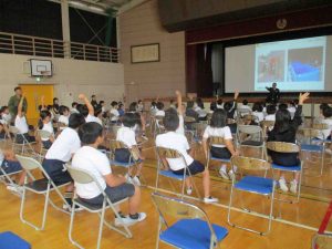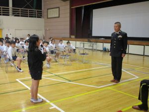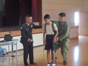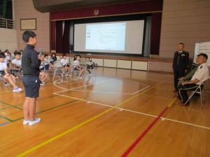「能登半島地震と自衛隊の活動について〜災害から命を守るために私達ができること〜」を演題に、能登半島地震の支援の様子と災害への備えや災害が起きたときにすべきことを教えていただきました。子どもたちは、地震発生後1時間で準備を終えて支援に出発されたこと、25kgもの荷物を背負い、土砂崩れの起こった近くや大きな岩が倒れてくるかもしれないところを長距離歩いて支援に向かわれたことに驚いていました。また、多くの方の命を守るために活動されたことに感動していました。