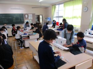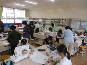 今、家庭科で、5年生は「お弁当包み」を、6年生は「ナップザック」をミシンで作っています。今週は3日間にわたって、地域の方がボランティアに来てくださいました。しつけのしかたやミシンの使い方など、困っているところをていねいに優しく教えてくださいます。おかげで作品作りはスムーズに進んでいます。本当にありがとうございました。