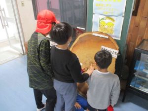 子どもたちは、さっそく、足を止めてじっくり見たり年輪を数えたりしていました。「木の匂いがする!」「木を切るところを見ていたよ!」などの声も聞かれました。