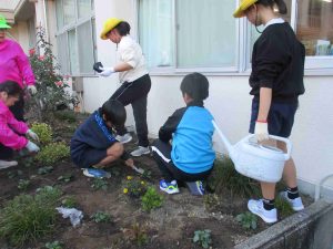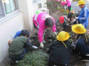 委員会の時間に、環境委員会と更生保護女性の会の方とで学校の花壇に花の苗を植えました。今回は、高学年玄関、来賓玄関に近い職員室前の花壇に苗を植えました。植え方を教えていただきながら、ビオラとパンジーをていねいに植えていきました。きれいに咲いたところを多くの方に見ていただけると思います。