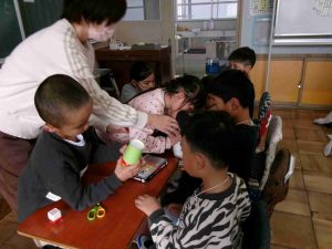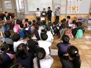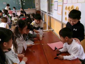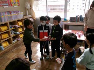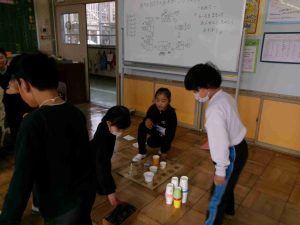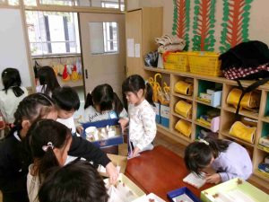 1年生が、稲津こども園の年長さんと生活科の授業で交流をしました。秋見つけで見つけたどんぐりや松ぼっくりなどを使って作ったおもちゃで遊んでもらうワークショップをしました。ワークショップは、「的入れ」「こま」「迷路」「けん玉」「やじろべえ」「マラカスづくり」の6つです。年長さんに楽しんでもらえるようにルールを考えたり、おもちゃを工夫したりしました。遊び方を説明する役、手本をする役、点数を記録する役、カードにはんこを押す役など、役割を分担しました。