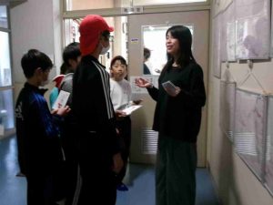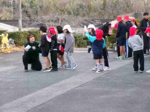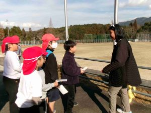英語担当の先生やALTの先生と英語で会話をすると、クリスマスカードにシールをもらえるという「クリスマスイベント」をしました。「How are you?」や「Do you like Christmas?」などの質問に英語で答えます。何人もの先生方にも協力してもらいました。どの先生のところにも長い列ができて、次々と英語で会話をしました。とても楽しいイベントになりました。