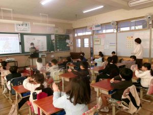 先週は発育測定を行いました。測定の前に、保健室の先生が、1、2年生には「手洗い」について、3〜6年生には「換気」についての保健指導を行いました。