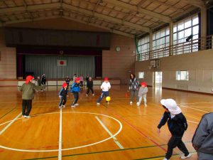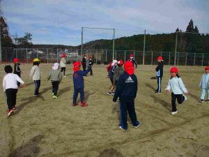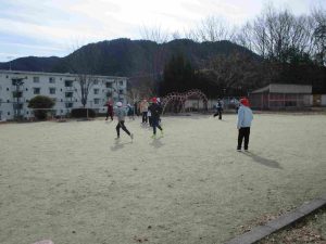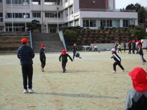 昼休みは、縦割りグループの山びこグループで「山びこ遊び」をしました。体育館や低学年グラウンド、グラウンドに分かれて1〜6年生が一緒になって遊びます。ドッジボールや田んぼの田などの遊びで、たくさん体を動かしました。風が冷たかったのですが、そこは「子どもは風の子」です。風の冷たさに負けずに、時間いっぱい楽しみました。