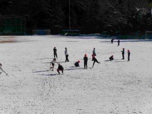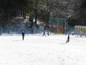 グラウンドには昨晩の雪が残っていて、朝は一面真っ白でした。20分やすみになると、子どもたちはグラウンドに飛び出してきて、さっそく雪遊びを始めました。雪合戦をしたり、かわいい雪だるまを作ったりと、今しかできない遊びを楽しみました。